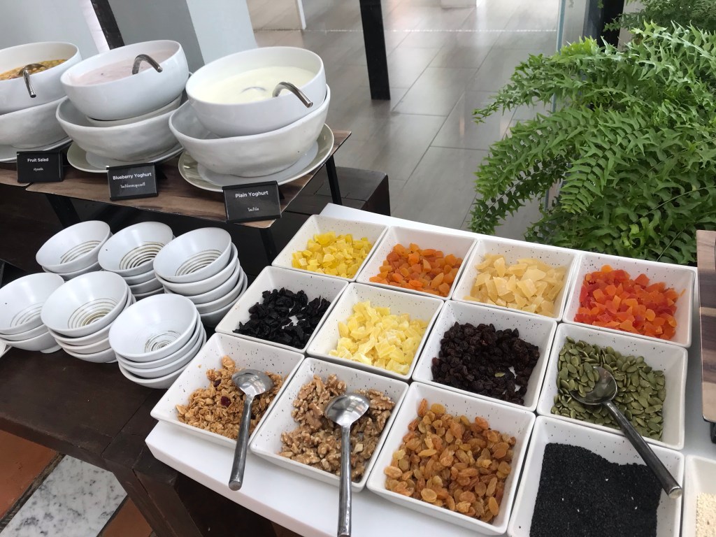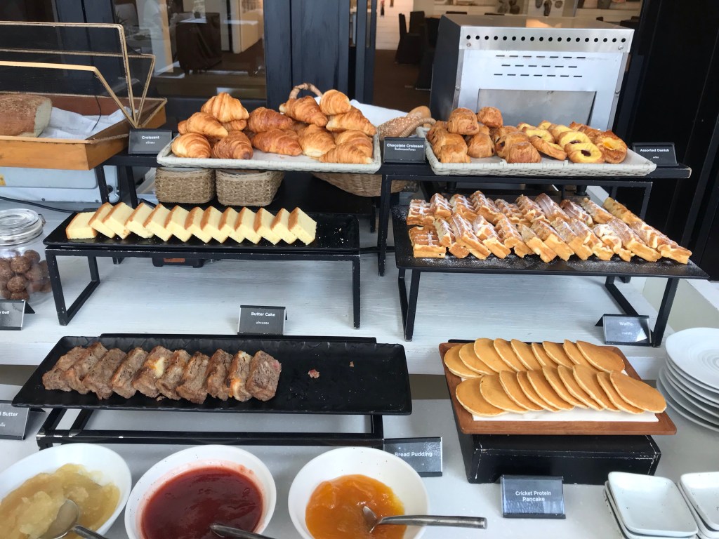 It includes salad, Thai style food, bread, juices and a variety of milk.