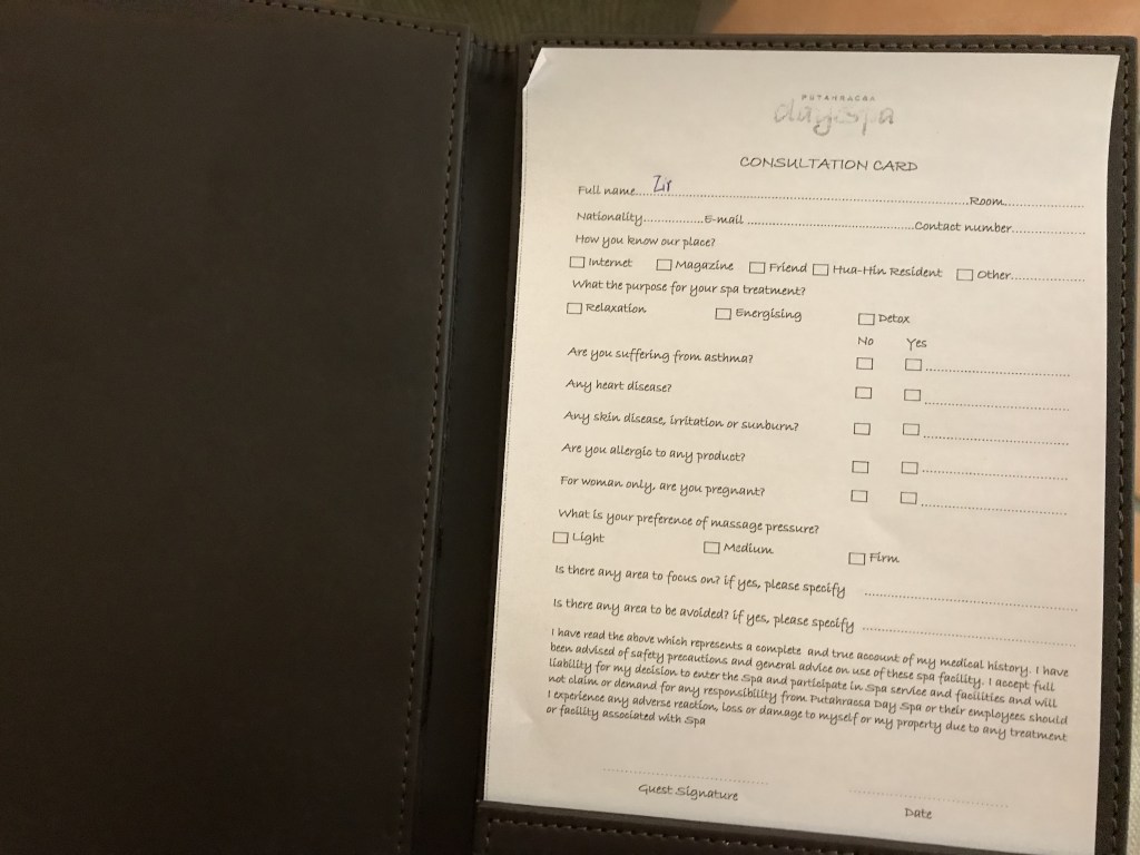 Before the treatment, we need to fill the Consultation Card Form. We have to fill all the questions they asked there, like do you have asthma/ heart disease/ any bad skin concerns/ any allergies/ are you pregnant, etc. And we also do filling the massage pressure level, the main points which you want to get massage and not.